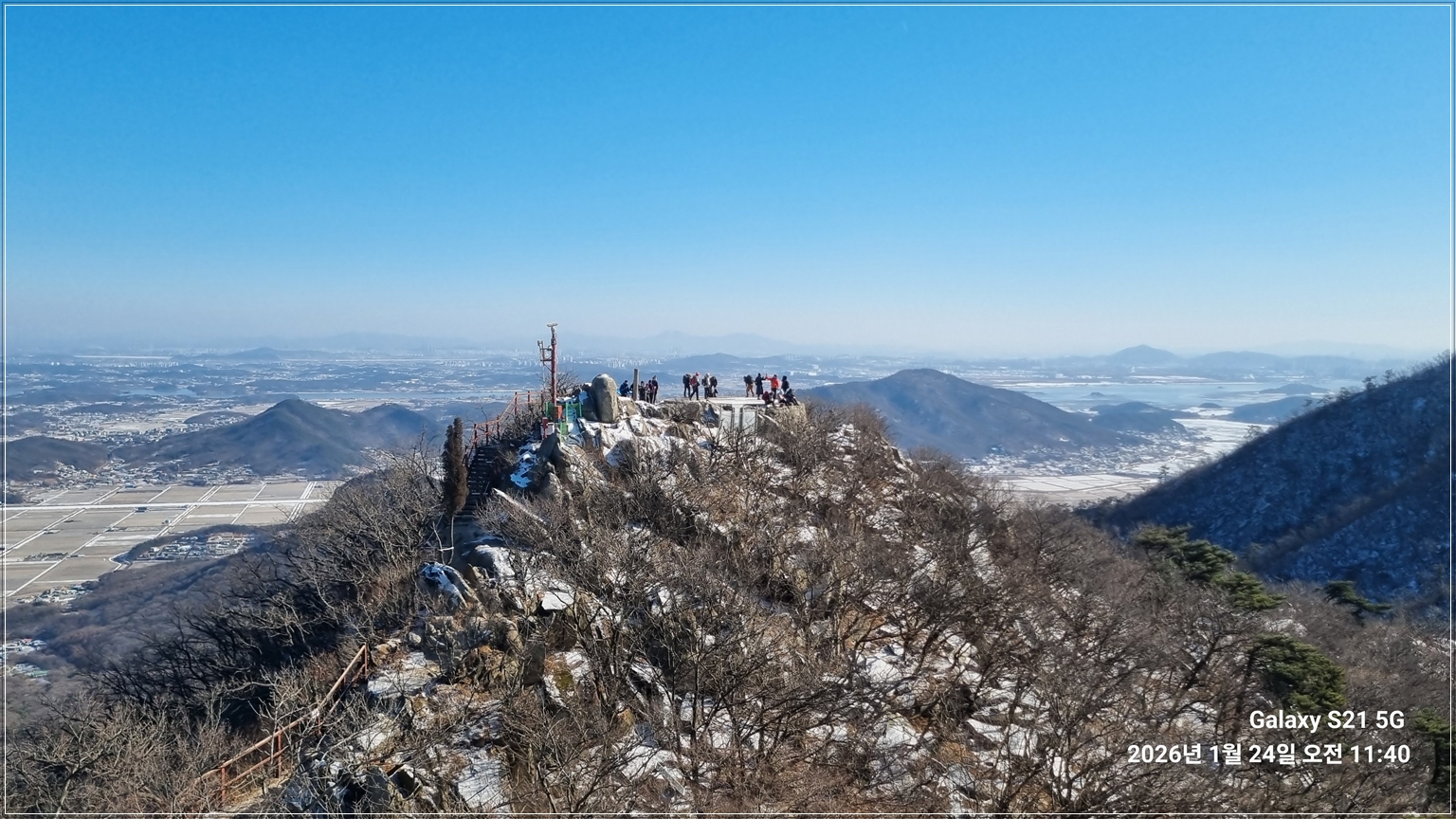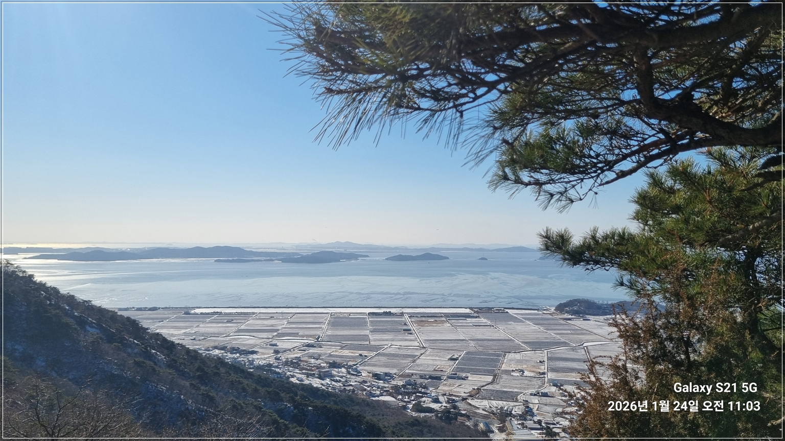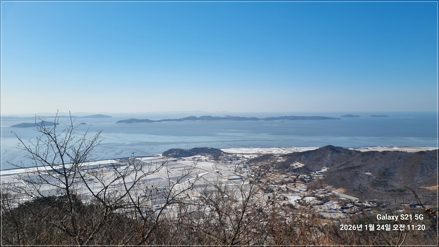 단군로가 주능선과 만나는 지점부터 등산하는 동안 시야가 훤하다. 바다와 섬, 염전, 논 그리고 인가가 차례로 눈에 들어오고 기분도 좋다.