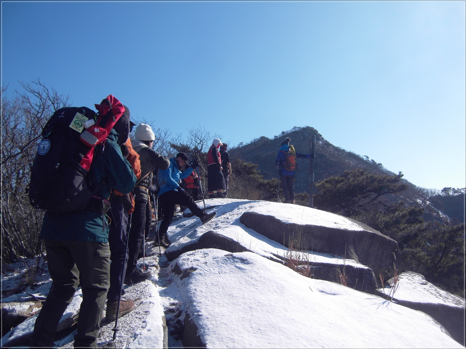 계단길이 고약해서 하산 중 사진은 없다. 계단로의 계단은 단 높이가 높아서 노약자는 불편했을 것이고 이런 계단을 만날 때마다 대한국인으로써 자존심에 상처(?)를 받는다. 중국에서는 잘 만들어 놓은 등산로계단을 우리는 왜 저리 못나게 만들었을까? 중국의 산 계단은 건물의 계단과 같이 단정하고 단높이 15㎝로 필요에 따라 약간 곡선으로 꼭 필요한 곳 외에는 난간 등 군더더기도 없이 잘 만들어 놓아서 괴물 같지 않고 마치 정원의 계단 같은데 그들은 해발 1,500m 이상의 산에도 하이힐을 신고 올라 다닌다.